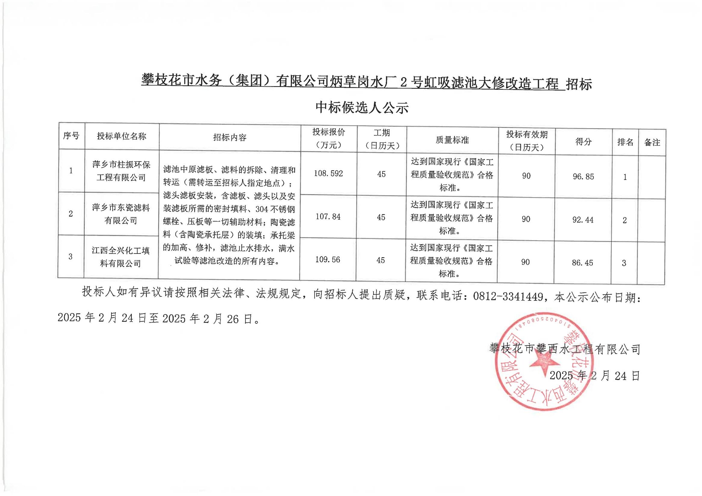 攀枝花市水務(wù)(集團(tuán))有限公司炳草崗水廠2號虹吸濾池大修改造工程中標(biāo)候選人公示