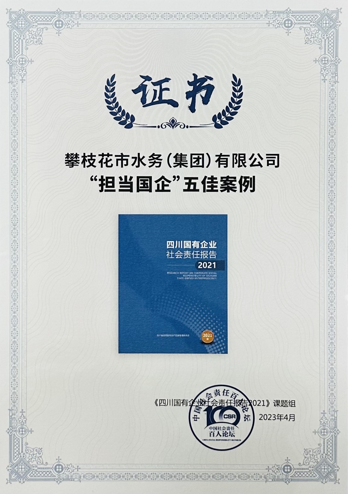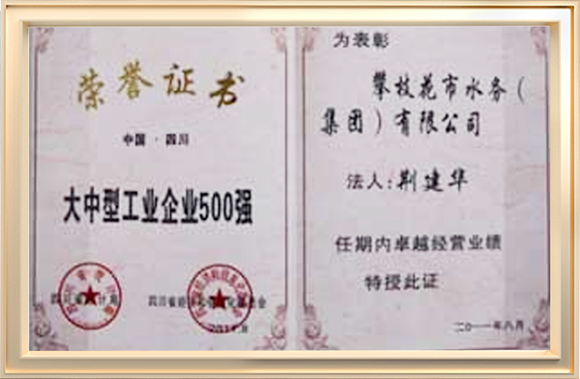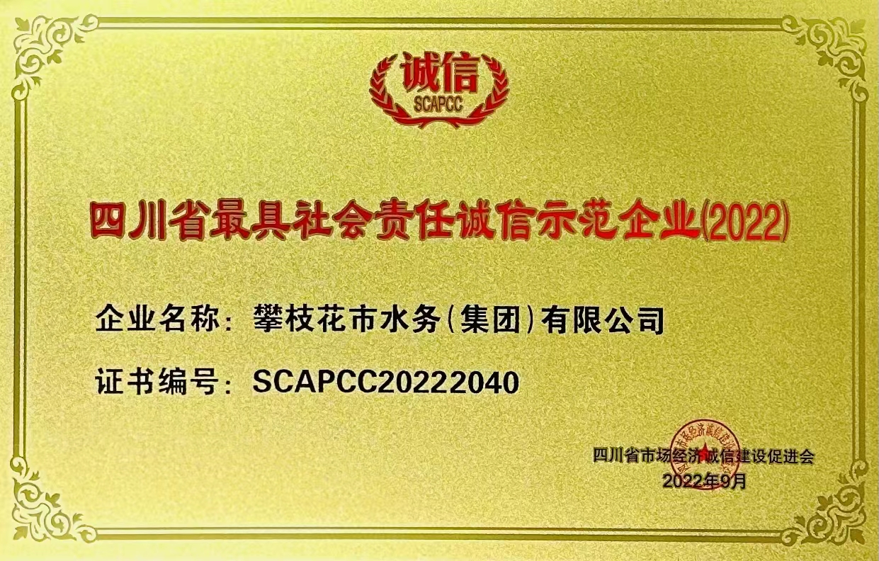 先后榮獲了全國模范勞動關(guān)系和諧企業(yè)、全國“五一"勞動獎狀、全國“安康杯競賽活動優(yōu)勝單位"、中國供水排水行業(yè)突出質(zhì)獻單位獎、全國模范職工之家、國家建設(shè)部精神文明建設(shè)先進單位、發(fā)揚“水之魂”精神為震后重建再立新功、四川省“五一”勞動獎狀、四川省誠信示范單位、四川省先進企業(yè)、四川省大中型工業(yè)企業(yè)500強、四川省水的生產(chǎn)和供應(yīng)最效益十強最大規(guī)模十強,攀枝花市企業(yè)50強,攀枝花市A級納稅單位等數(shù)十項帶譽稱號。